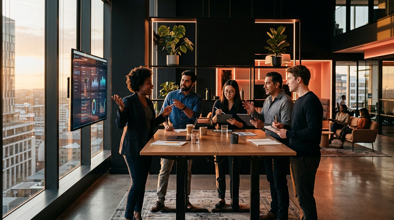 Prompt: "A vibrant open-plan tech office with engineers collaborating at standing desks, multiple monitors showing code, a team celebrating a successful deployment with high-fives, casual dress code, snack bar in the background, energetic and collaborative atmosphere, modern startup vibes"