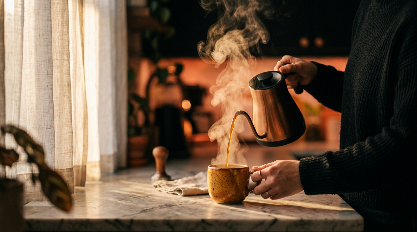 "Morning sunlight on a ceramic nightstand with a jade roller and candle, hands pouring matcha from a bamboo whisk into a handmade cup, gentle face massage with a gua sha stone, the person sitting cross-legged on a meditation cushion, warm earth-toned aesthetic throughout, peaceful and aspirational self-care content"